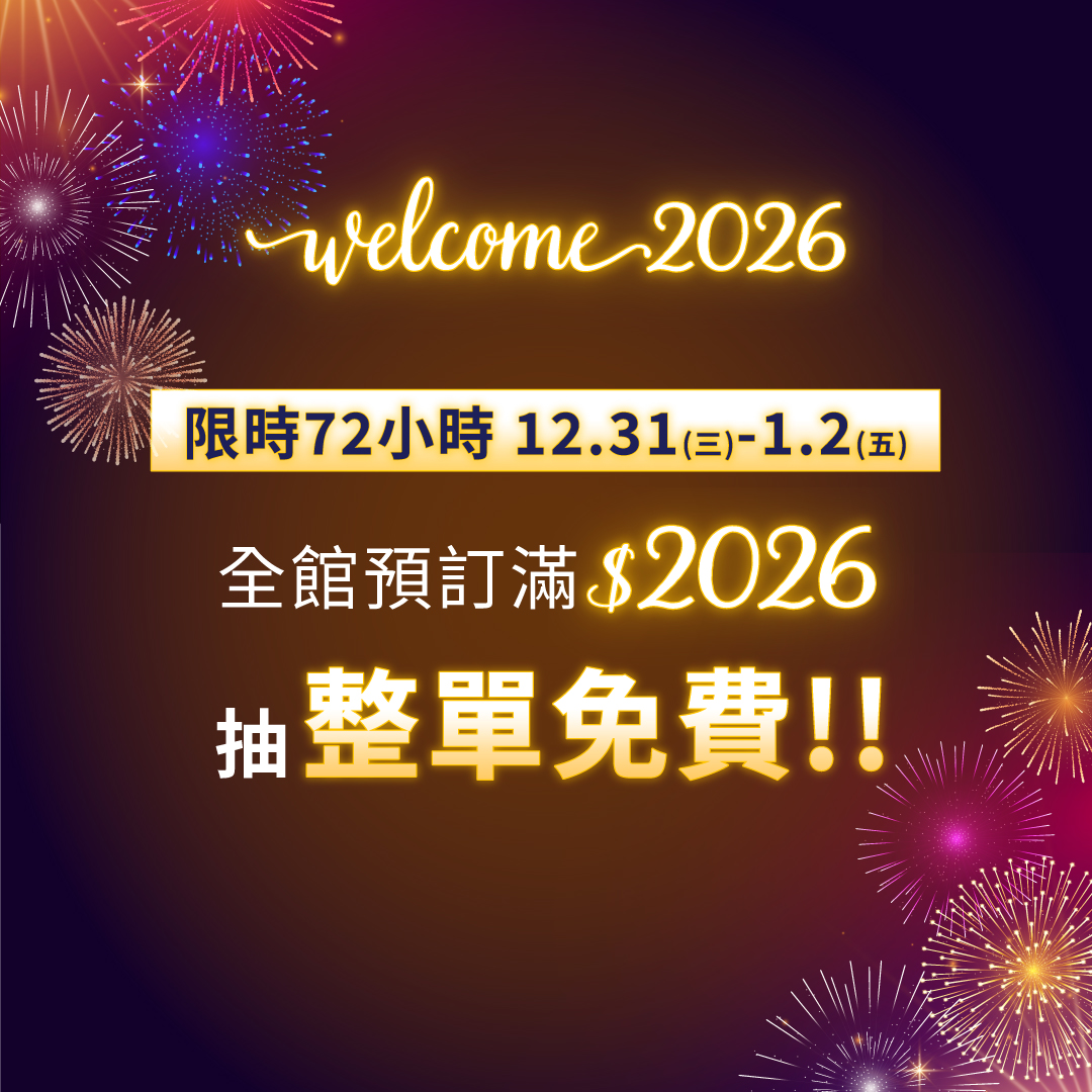 全館滿$2026 抽免單 (活動期間: 即日起-1/2 23:59)