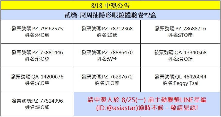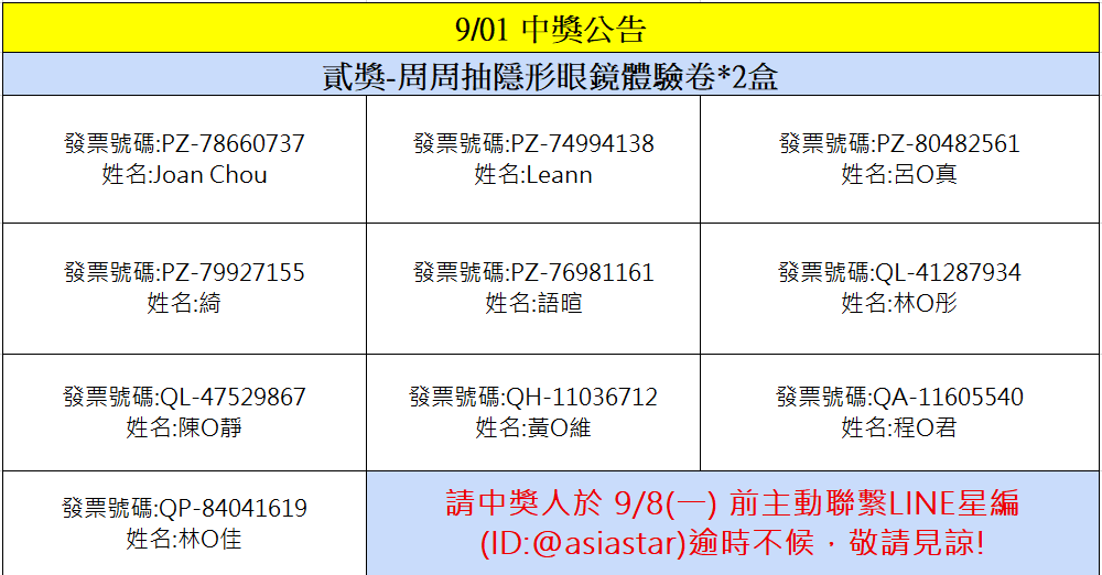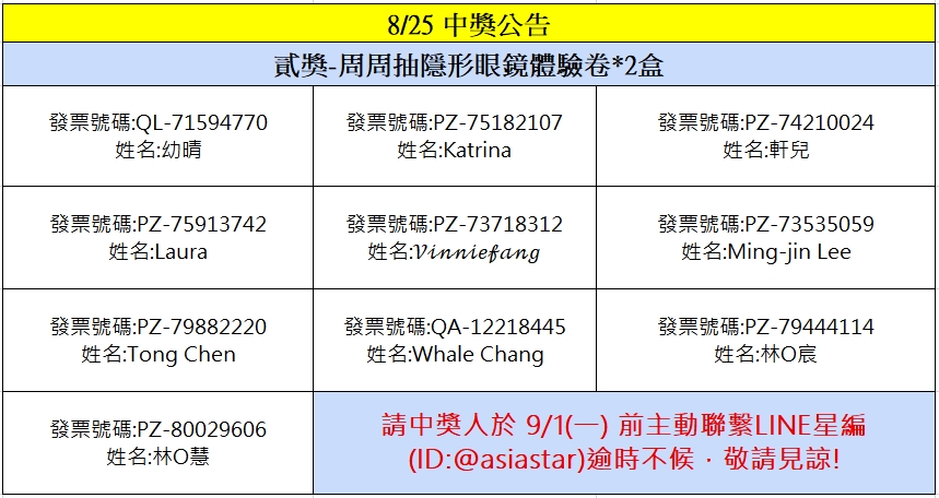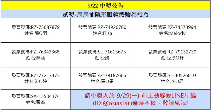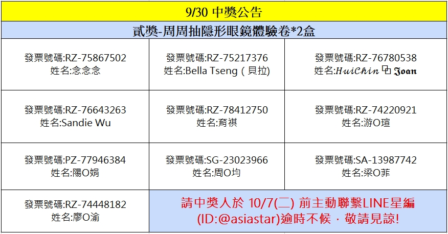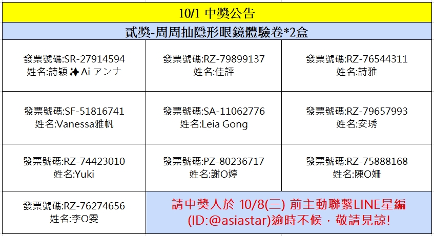 星粉獎獎項:安視達Eye訂網配送折價券新台幣100元、安視達Eye訂網配送折價券新台幣50元、蜜緹品項限量隱眼兌換券、媞蜜多品項限量隱眼兌換券、安視達Eye訂網紅利點數3000點、安視達Eye訂網紅利點數5000點、安視達Eye訂網紅利點數10,000點、滿額免運劵、海昌粉紅玻尿酸保養液(420ml+120ml×2) 滿額贈、Line Points 200點(每品項限量贈送,若該品項贈完將提供其他獎項)